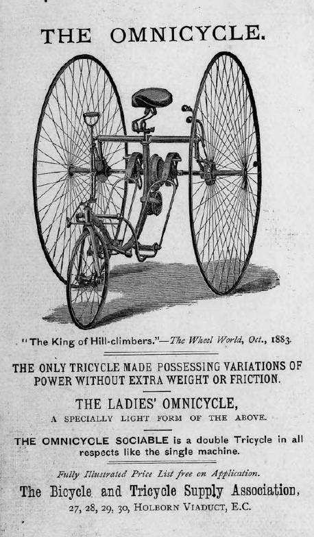 In a discussion of the relative merits of various ‘tricycles for country practice’ in the British Medical Journal of 27 May 1882, one correspondent recommended the Omnicycle ‘for those living in very hilly districts’ because of its variable gearing. Other letters published over the following year or two testify to its popularity among GPs of the day. Indeed, by 1884 it was being marketed as ‘the Tricycle for Medical Practitioners’.