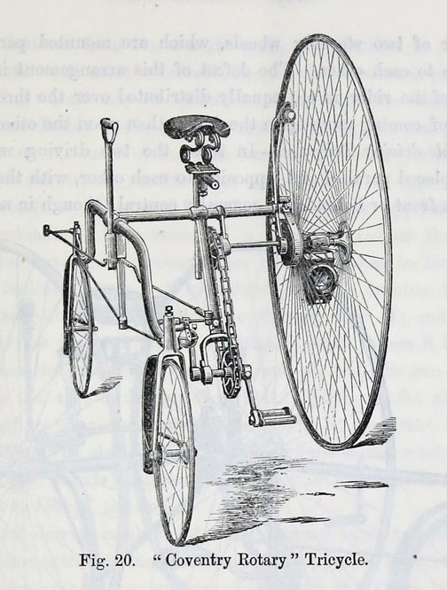 James Starley had in 1876 introduced the Coventry Lever Tricycle, sparking a tricycling craze in Britain. The modern-style ‘safety bicycle’ (with front and rear wheels of equal size) had yet to be invented, and the precarious penny-farthing, or high-wheeler, was mostly the preserve of daring young fellows. Tricycles, by contrast, could be ridden by less athletic gentlemen and even by ladies in long dresses.
