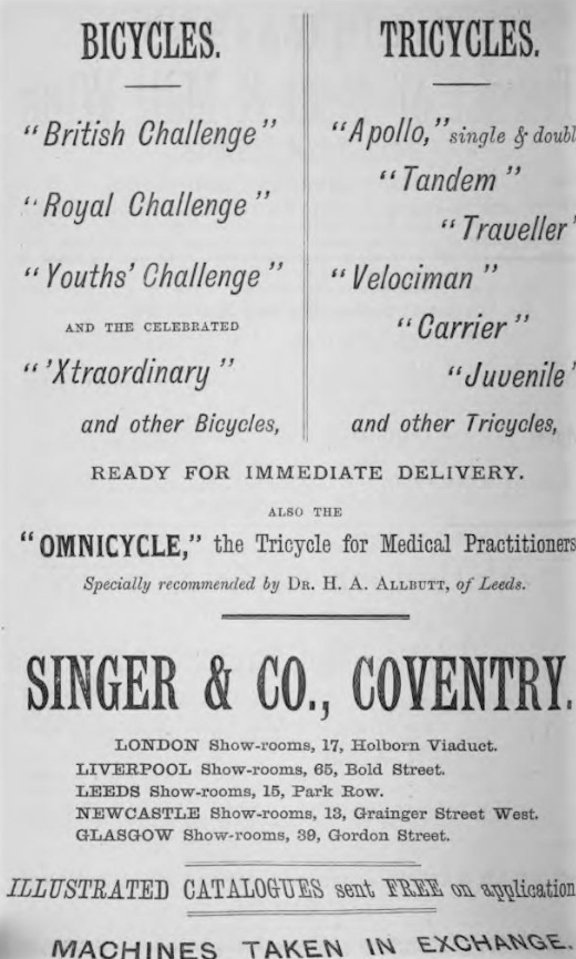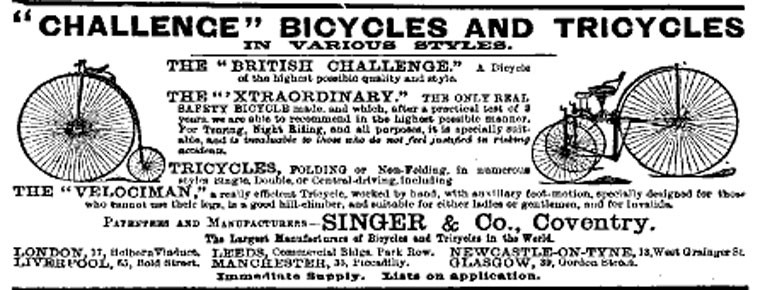 Nahum Salamon (c. 1830–1900) is credited with introducing the Howe sewing machine to Britain from the USA in 1859. During the 1870s, he became a mover and shaker of the British cycle industry as manager of the Coventry Machinists Co. (CMC). Early in 1881, he set up the Bicycle and Tricycle Supply Association, a retail operation trading at Holborn Viaduct in London, where many cycle manufacturers also had offices. He filed a number of patents and had bicycles made by Singer & Co. in Coventry. However, he was clearly looking to add a tricycle to his product portfolio.