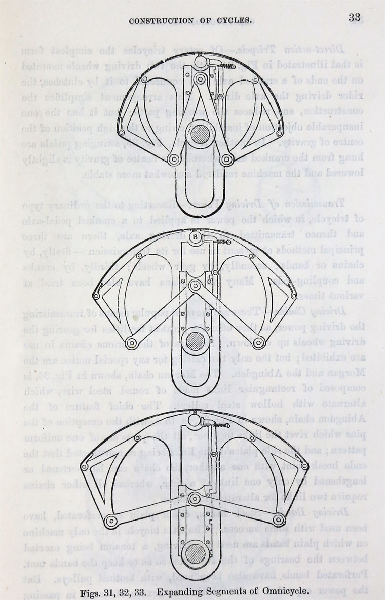 The pedal levers are connected by bands to two expanding segments, which are each connected to the driving axle by clutches, and to each other by a reversing apparatus, so that the forward movement of the one produces the backward movement of the other, and thus the descending pedal raises the other ready for the next stroke. The segments are constructed so that they can be expanded or contracted, so as to give greater or less leverage, as shown in Figs. 31, 32, and 33, in which the segments are represented at their extreme and mean radii.