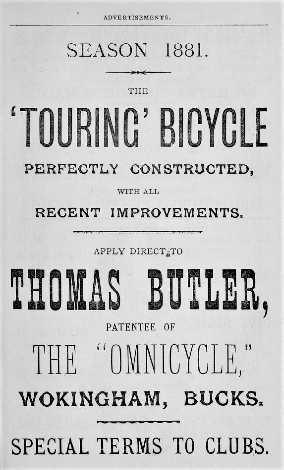 By the start of April 1881, Tom was employing eight men and two boys at his works. As well as the upgraded Omnicycle, he was selling a touring bicycle, which he advertised in that year’s edition of The ‘Indispensable’ Bicyclist’s Handbook by Henry Sturmey.