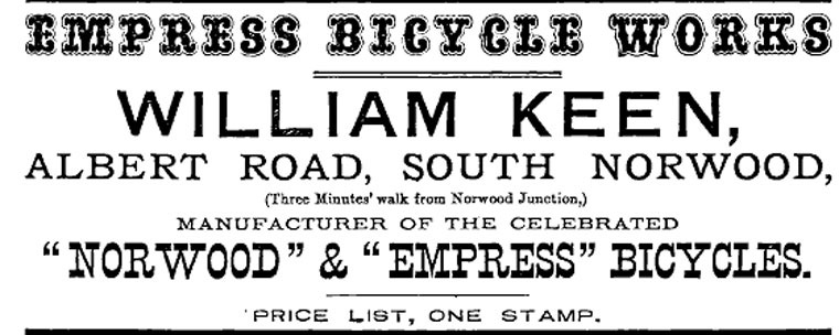 So, on 24 June 1878, Tom ventured into London with the plans and a list of cycle makers in a last-ditch attempt to save the project. His first port of call was William Keen at the Empress Bicycle Works in South Norwood, whom he felt was their best bet. As luck would have it, ‘Keen, without any word to the contrary, at once understood the job’ and agreed to take it on.
